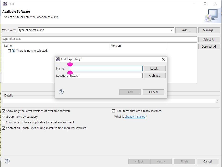 ADD를 누르고 이름에 Amateras를 입력하고 Location은 복사한 링크를 넣으면 된다.