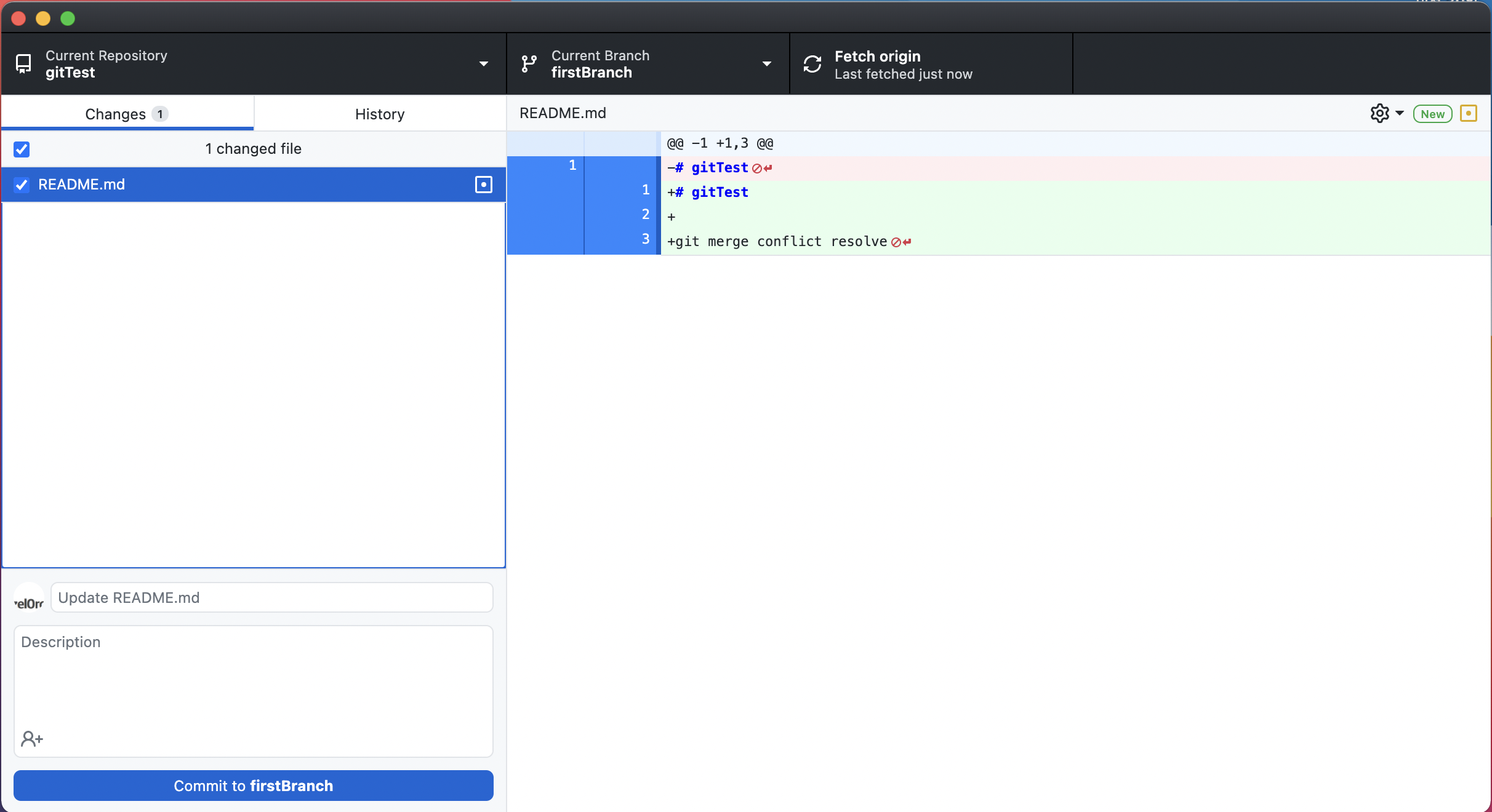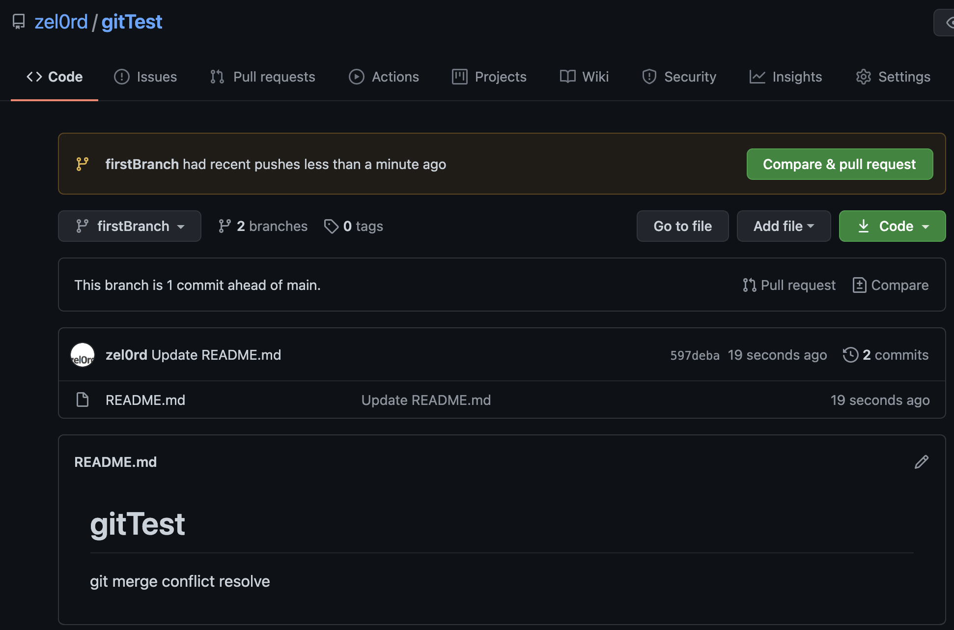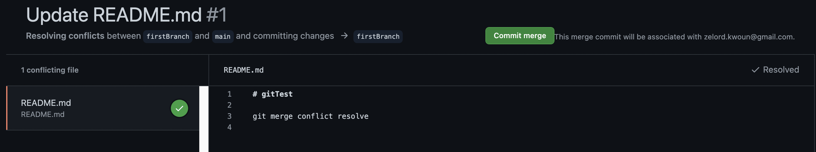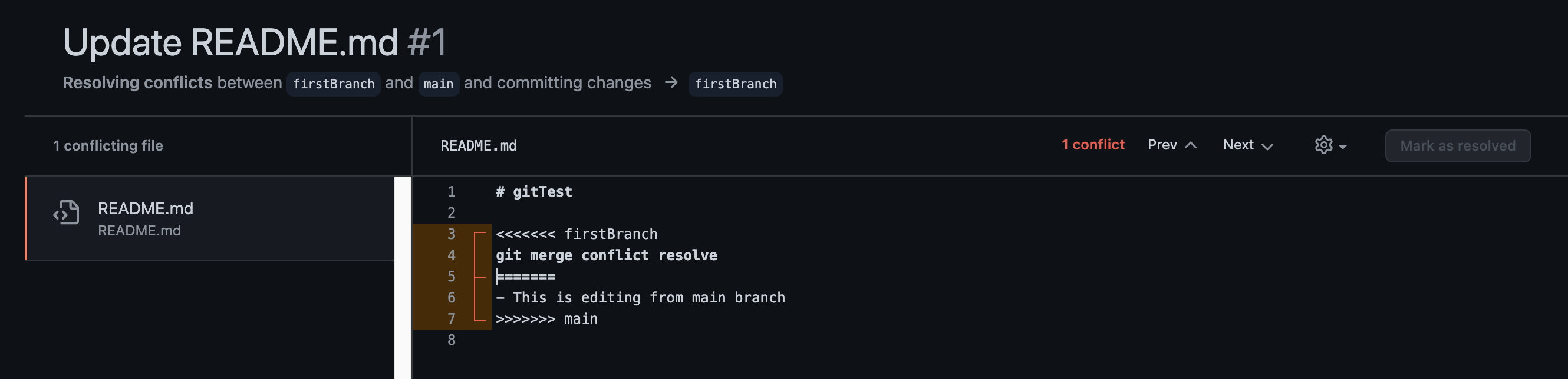 내가 가정한 상황은 main 브랜치가 있고, 내가 작업중인 firstBranch가 있다. 내가 작업한 내용으로 PR을 보냈고, 이 때 main 브랜치에 변경이 생겼을 때 발생하는 conflict에 대해 resolve를 해보려고 한다.