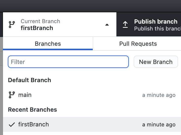 4. 이렇게 firstBranch가 생겼으면 current Branch옆에 publish branch를 눌러준다.