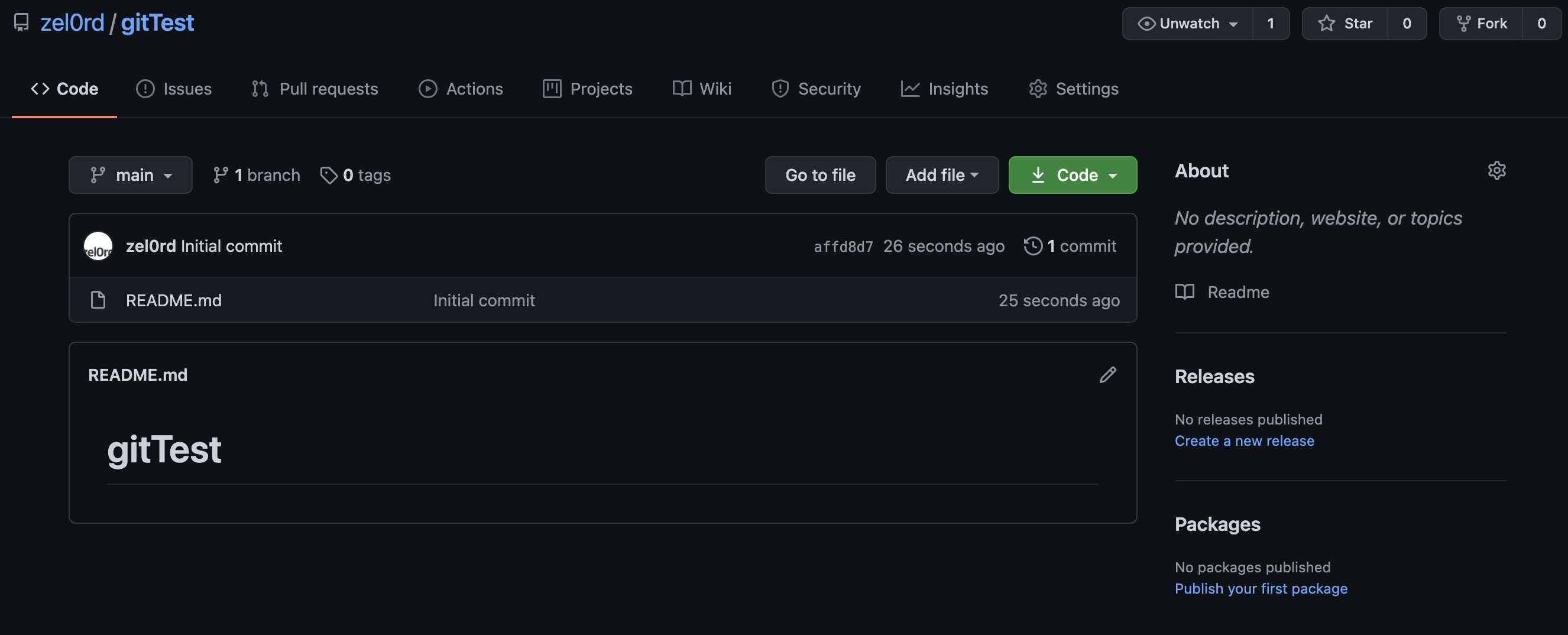 1. 첫번째로 gitTest라는 저장소를 생성했다.
