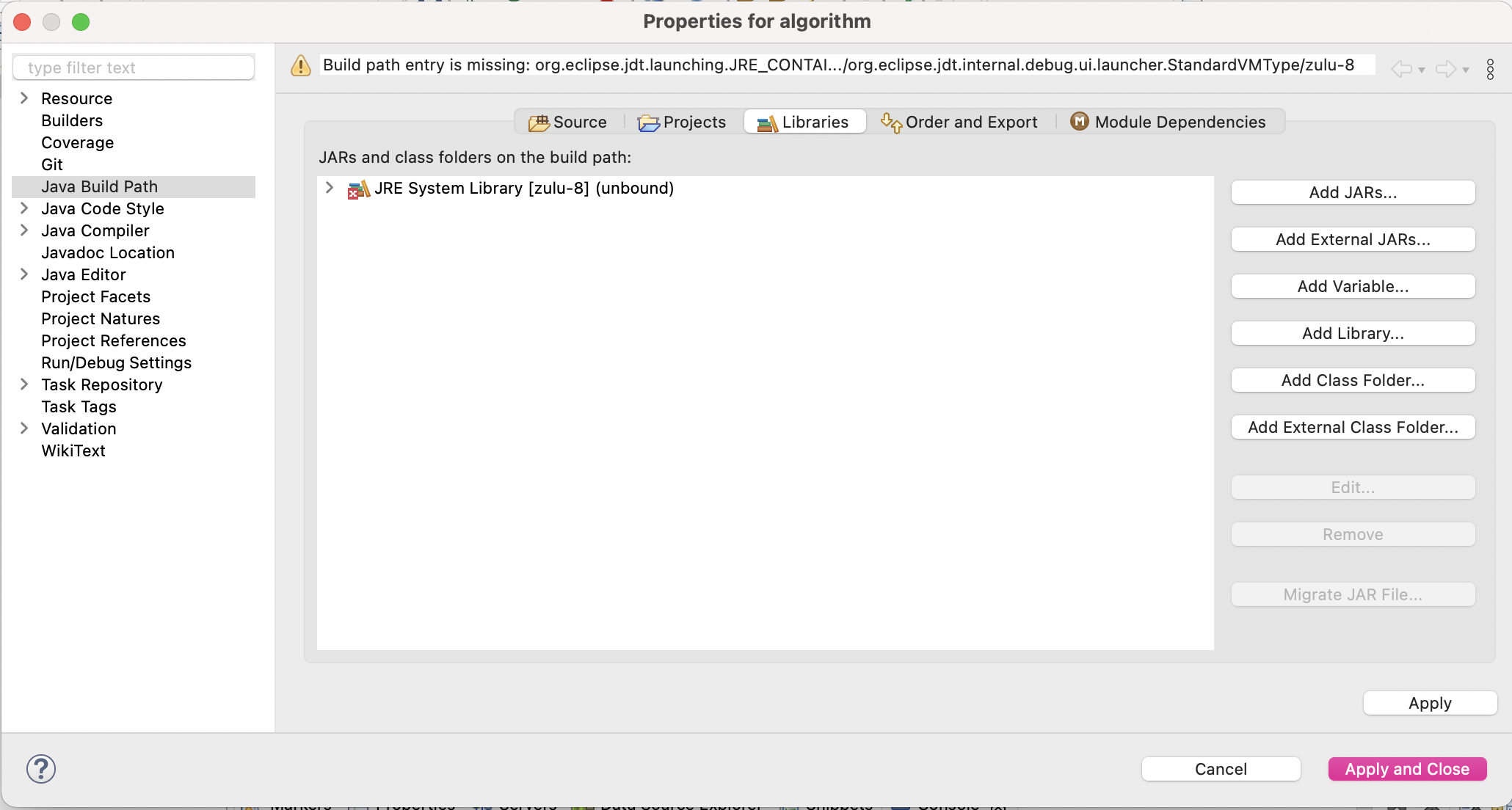 이렇게 Java Build Path -> Libraries 에 zulu-8이 언바운드 되어있다고 나온다.