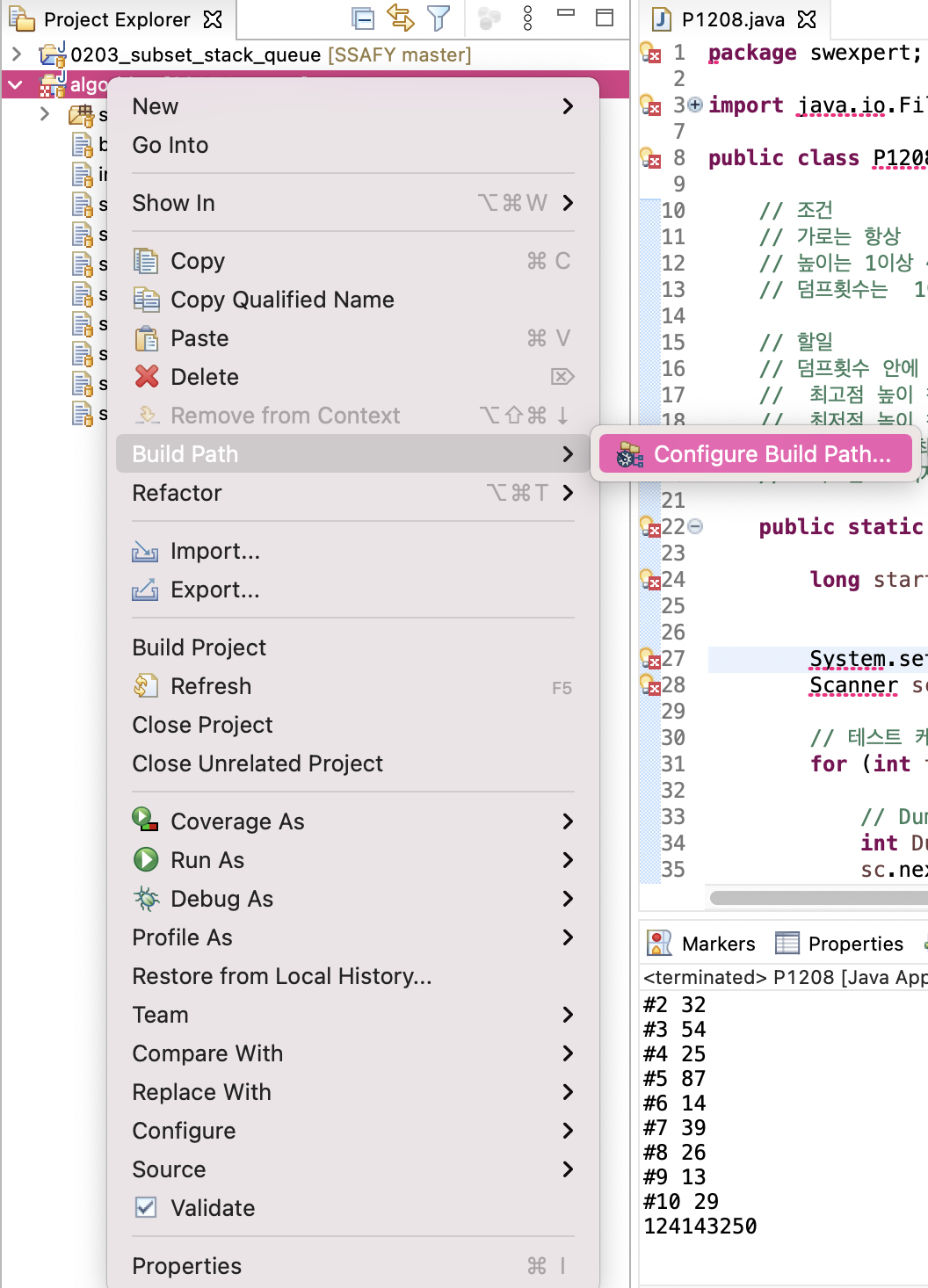 외부 프로젝트를 Import할 때, build path가 맞지 않으면 아래와 같이 코드에 빨간 줄이 생기게 된다.