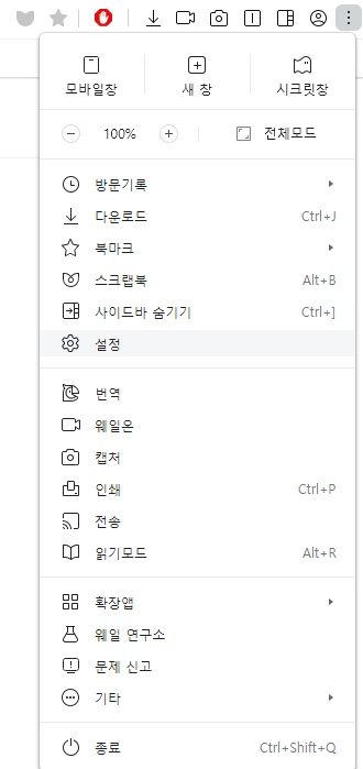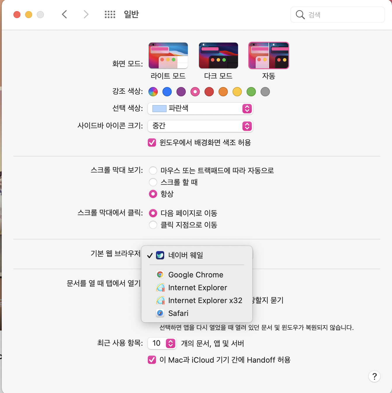 그리고 기본 브라우저 설정을 환경설정 -> 일반 -> 기본 웹 브라우저를 선택할 수 있다.