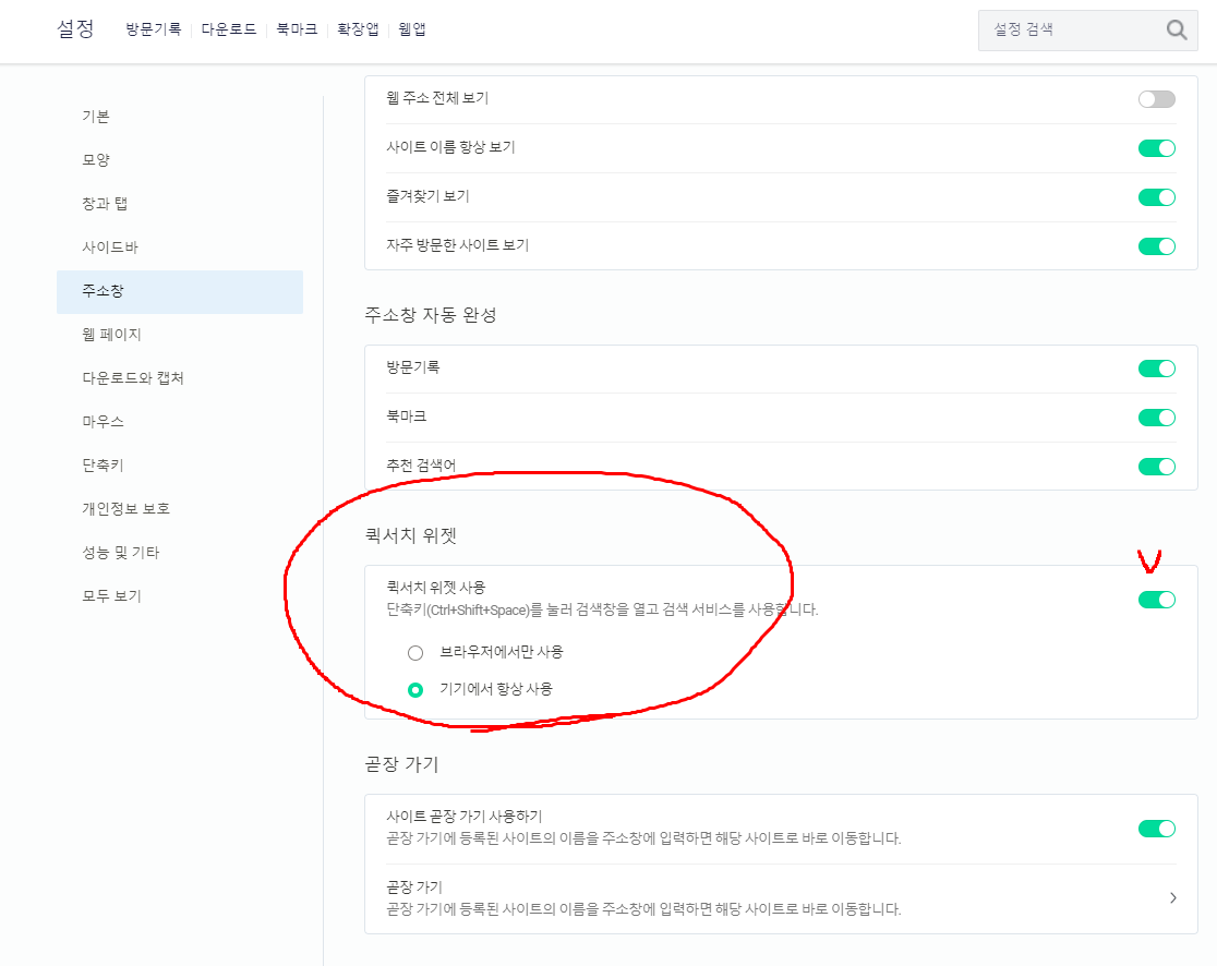 설정 -> 주소창에서 퀵서치 위젯을 활성화 하고, 기기에서 항상 사용으로 설정하면