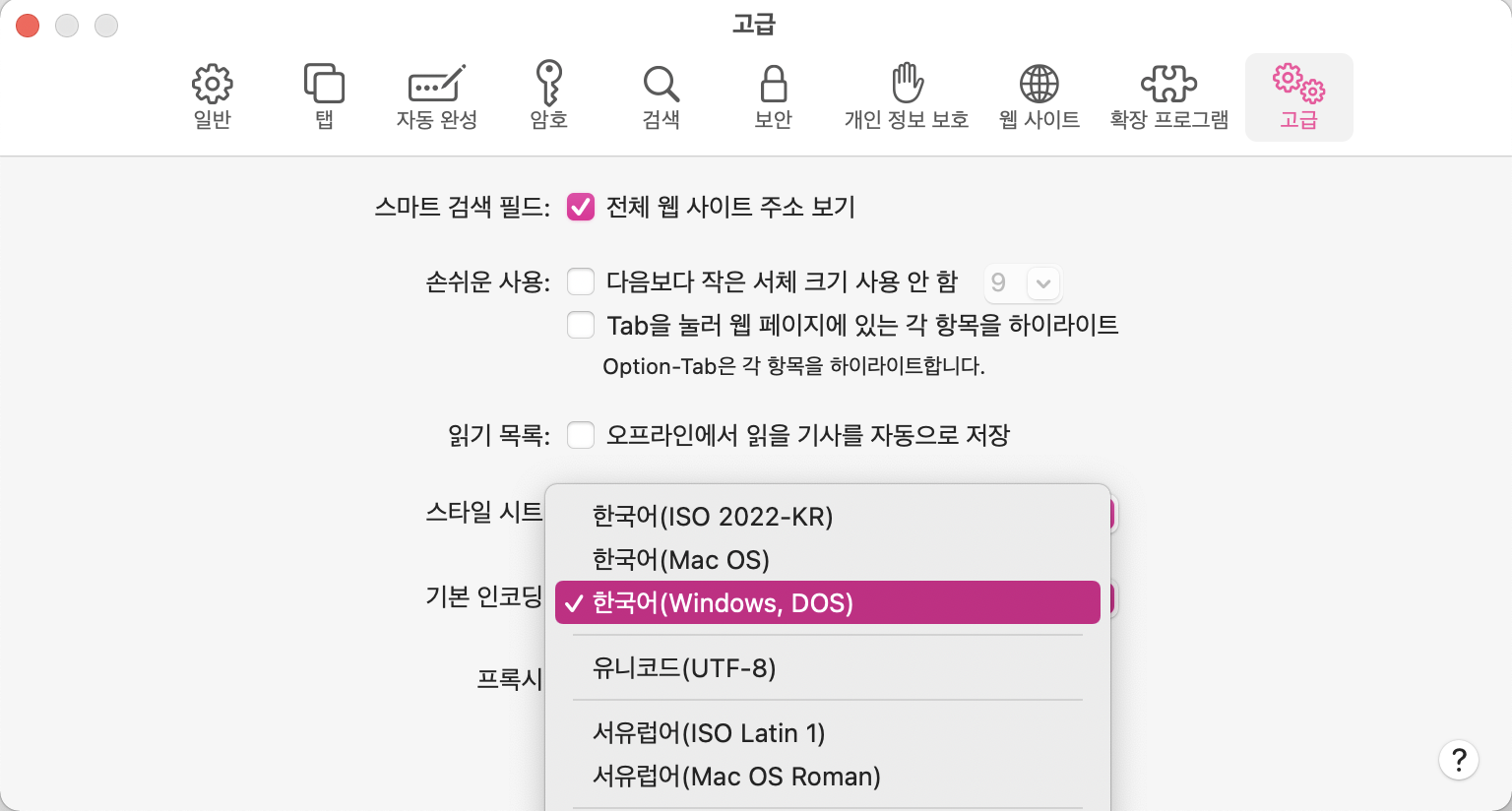결국 해결한 방법은 safari -> 환경설정 -> 고급 -> 기본 인코딩을 변경해주었다.
