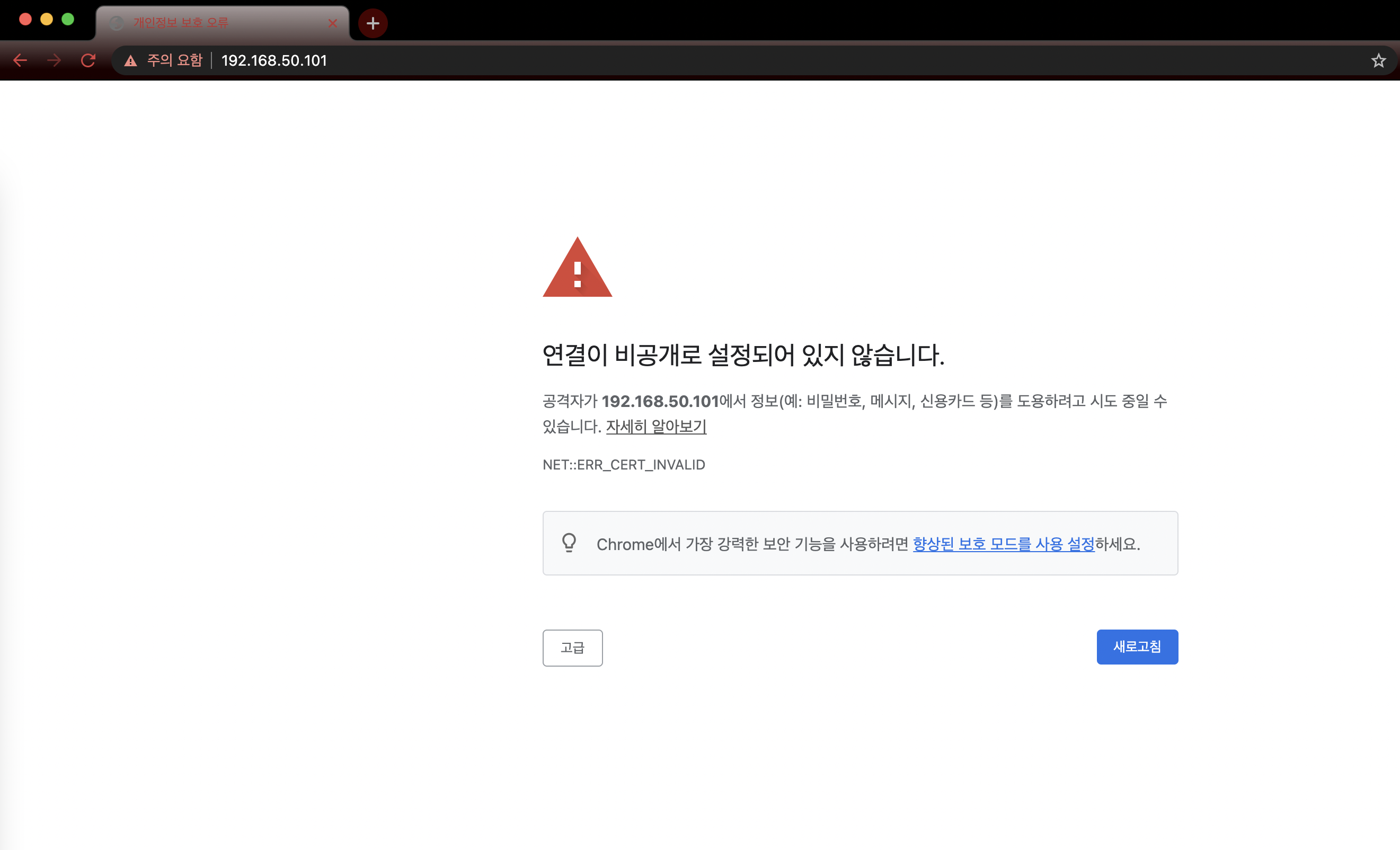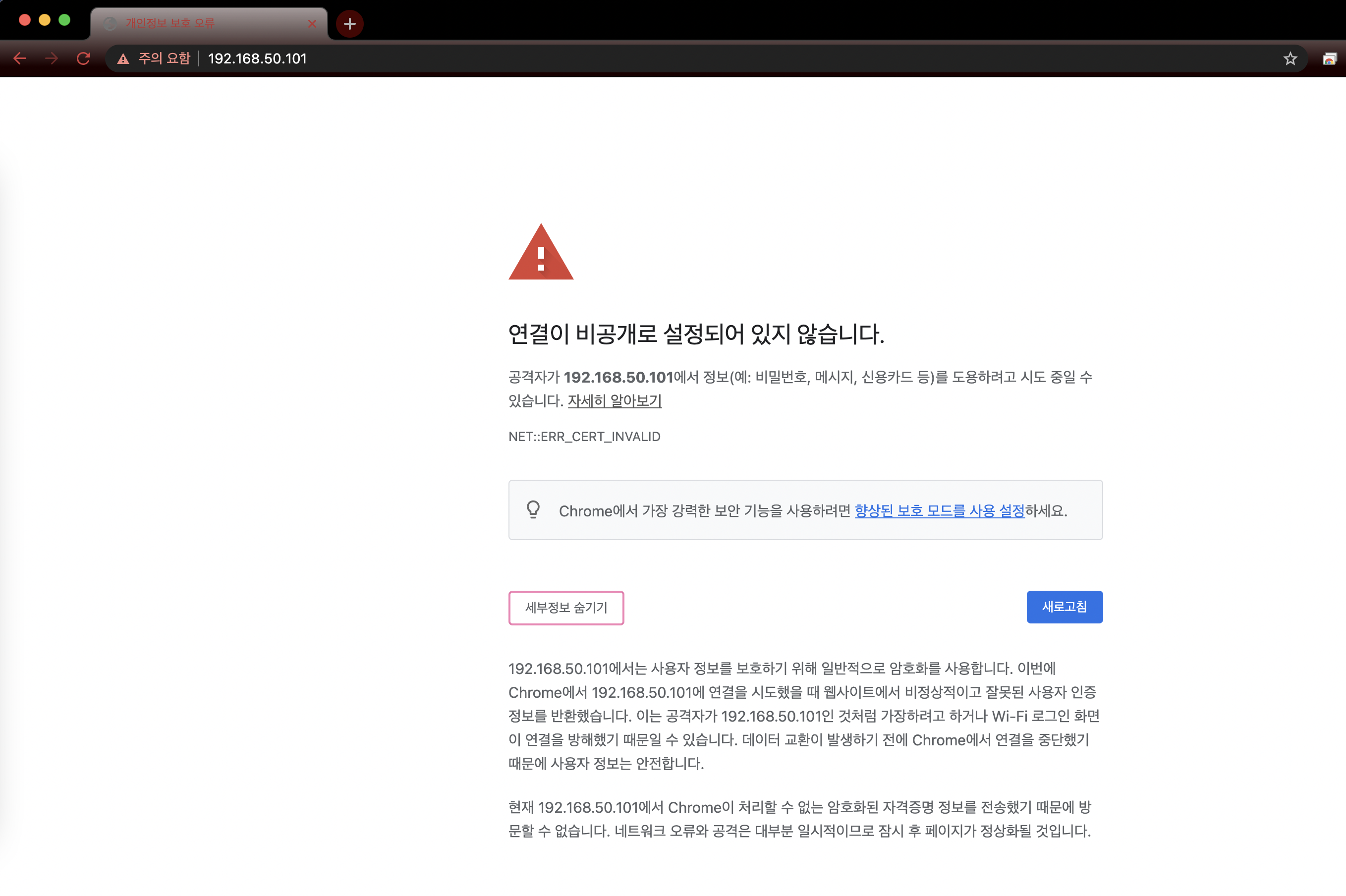mac에서 크롬을 사용하다보면 이렇게 신뢰되지 않은 인증서로 인한 경고 페이지를 보게된다.