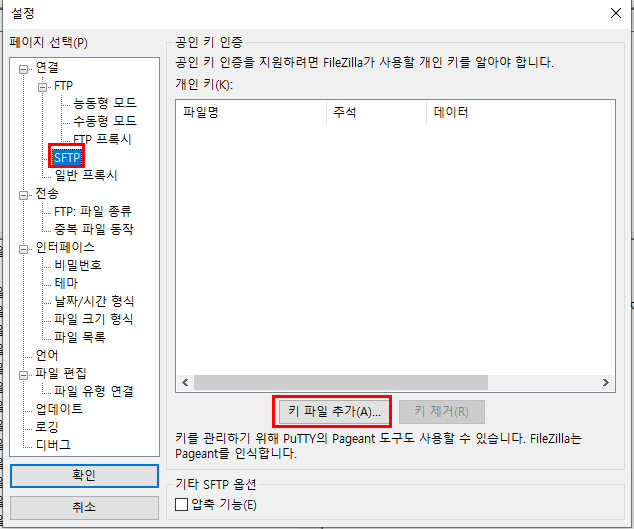 설정 탭에 SFTP에 들어가서 키파일 추가 버튼을 이용하여 키 파일을 추가해준다.