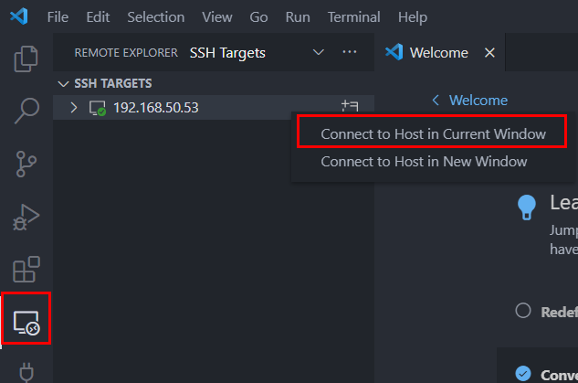 왼쪽에 있는 컴퓨터 모양 탭을 눌러 SSH Targets을 선택하면 접속이 잘된다.