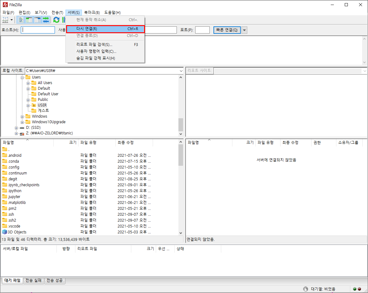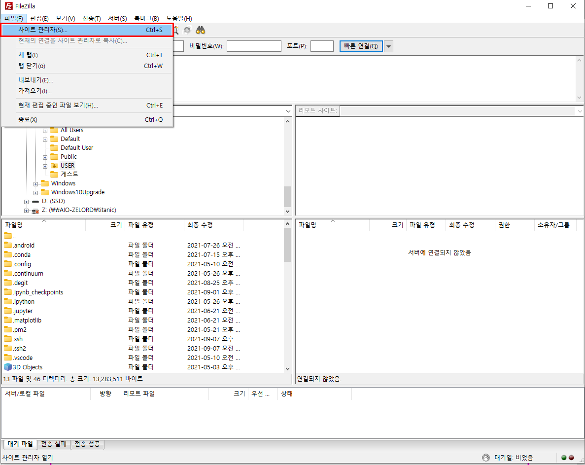 처음 filezilla를 켜고 나서 사이트 관리자로 이동한다.