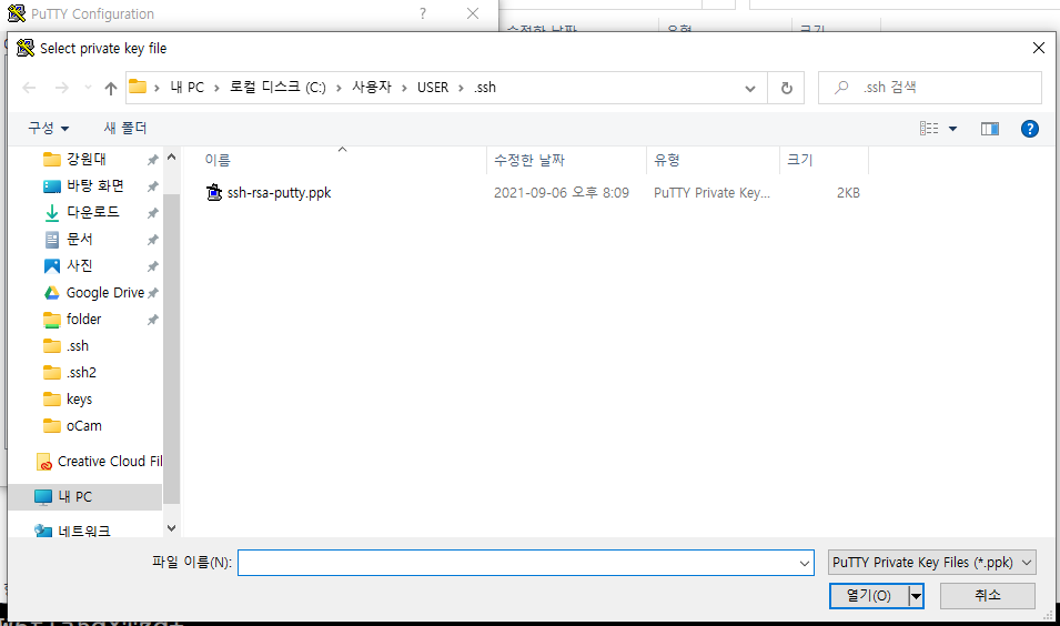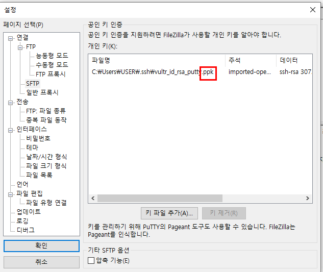 그리고 putty를 접속할 때 사용했던 ppk 파일을 개인 키 파일에 넣어준다.
