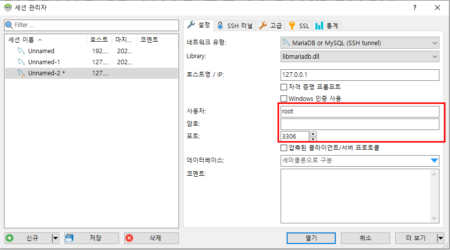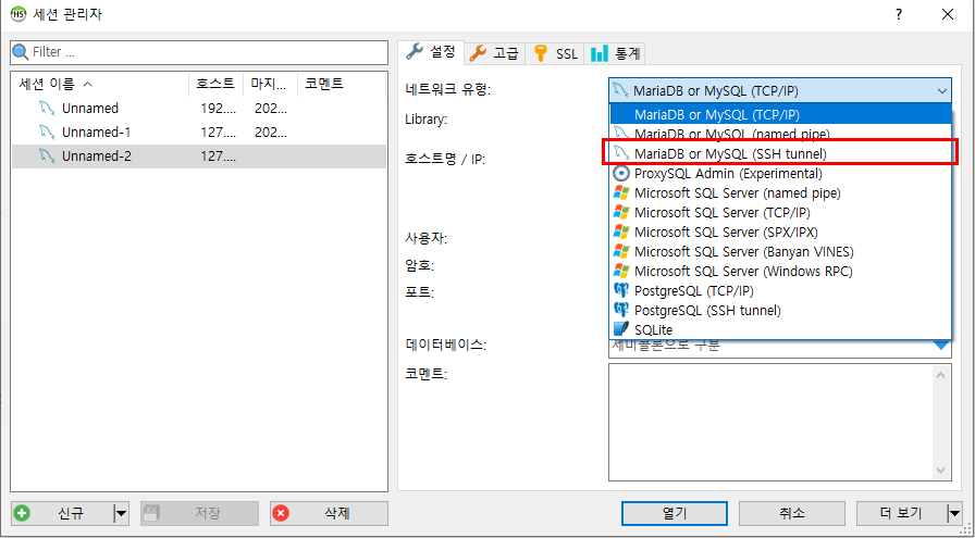 Heidi SQL을 실행시키고 첫번째로 네트워크 유형을 바꿔줘야한다.