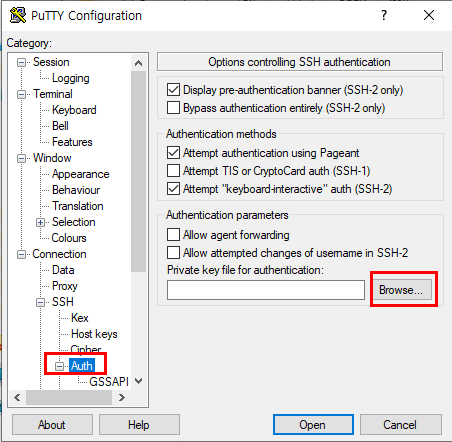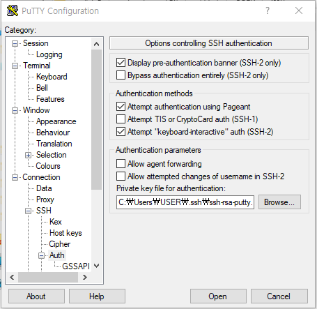 왼쪽 탭에서 Connection - SSH - Auth로 이동하여 Browse를 눌러 방금 만든 .ppk 파일을 로드한다.