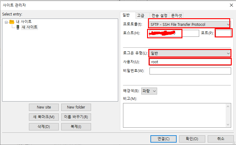 사이트 관리자로 이동하였으면 프로토콜을 SFTP로 변경하고, 호스트에는 서버 IP, 포트에는 22(SSH), 로그온 유형은 일반 사용자에는 계정을 넣고 확인버튼을 누른다.