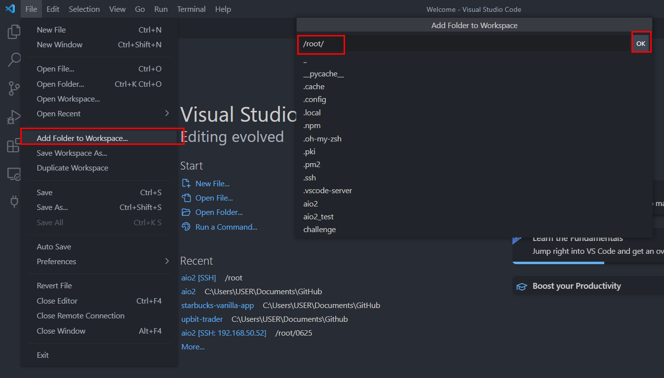 특별한 에러없이 접속이 잘 되었으면 File - Add Forder to Workspace로 원하는 디렉터리를 가져오면 된다.