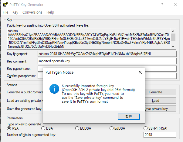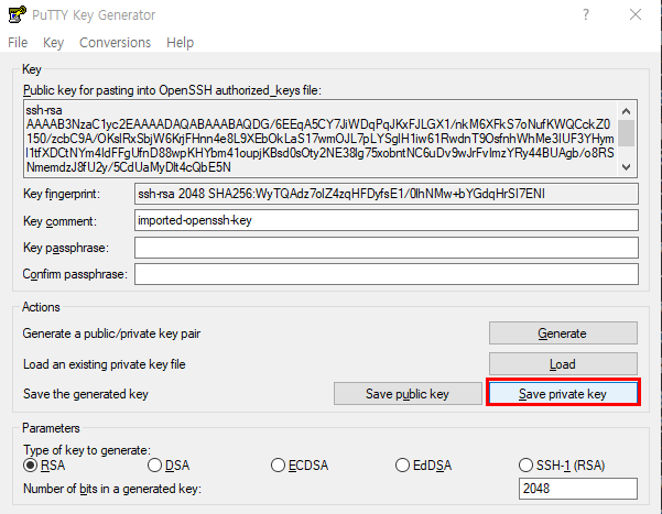 정상적으로 키를 불러오면, 이렇게 putty에 형식에 맞게 잘 적용이 되고, Save private key를 눌러 저장한다.
