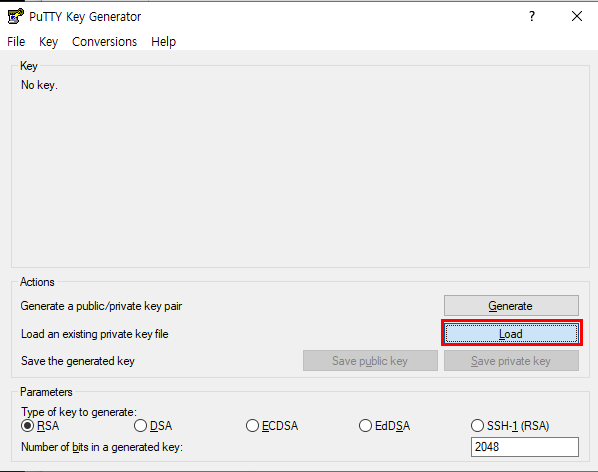 puttygen을 실행하여 Load버튼을 눌러, 이전에 C:\Users\USER\.ssh에 저장된 키를 불러온다.