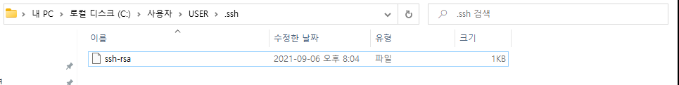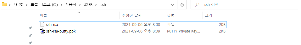 id_rsa와 id_rsa.pub라는 키 파일이 두 개 생성된 것을 확인할 수 있다.