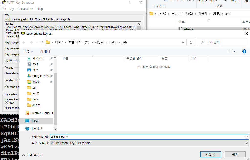 같은 경로에 이름만 바꿔 저장하면 .ppk 형식으로 저장이 되어 putty를 통해 로그인할 때 사용할 수 있다.