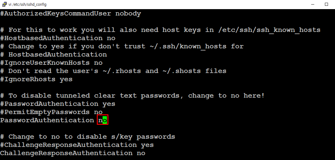 ssh를 비밀번호가 아닌 key방식으로 인증하도록 설정이 끝났으면 이제 비밀번호를 통한 로그인을 비활성화 해야한다.