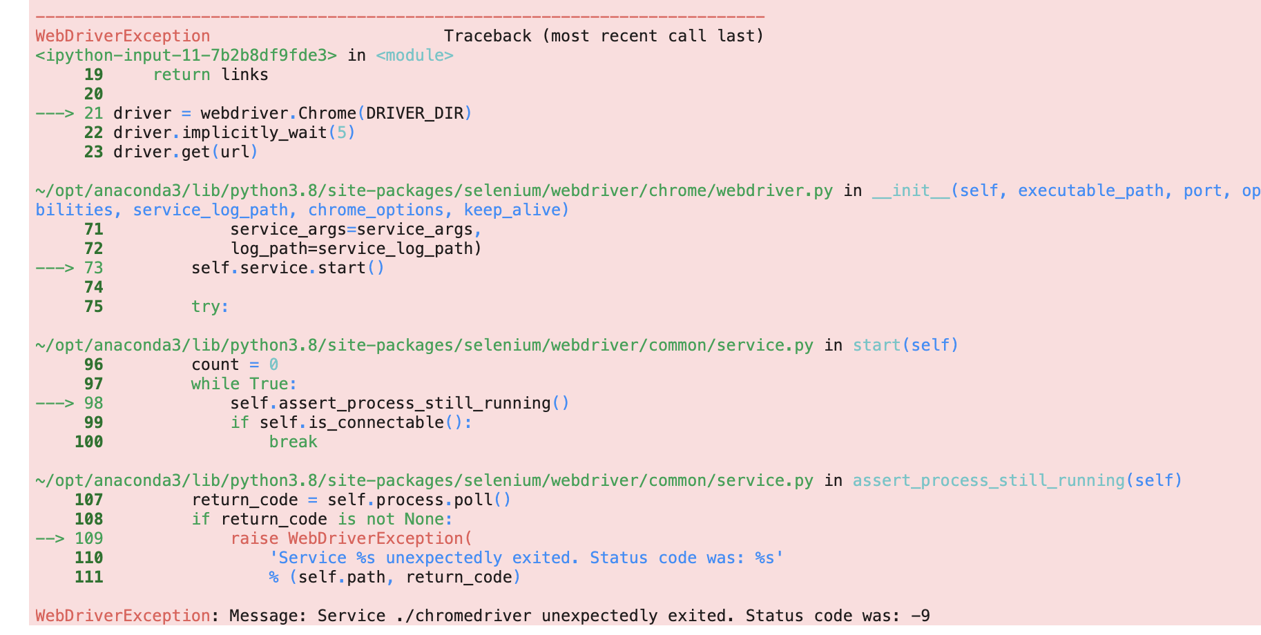 chrome driver status code -9 해결