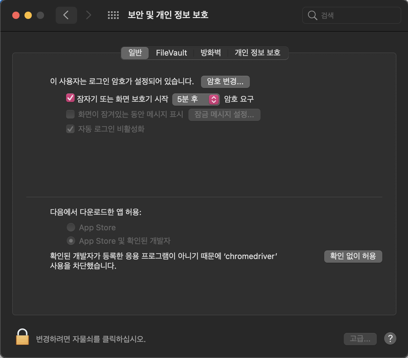 애플 -> 시스템 환경설정 -> 보안 및 개인 정보 보호