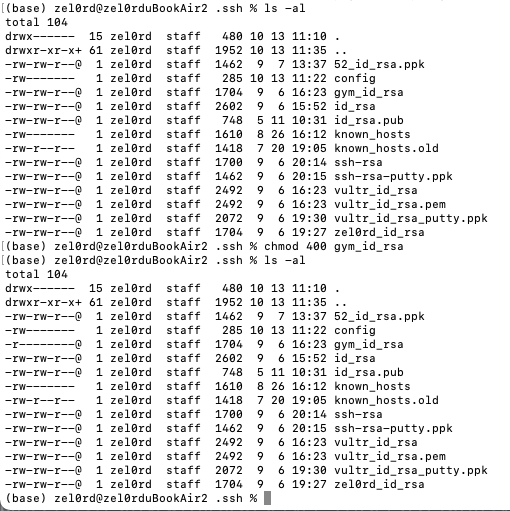 그래서 사용했던 키 파일의 권한을 확인해봤더니, 0664로 되어 있는 것을 확인했고