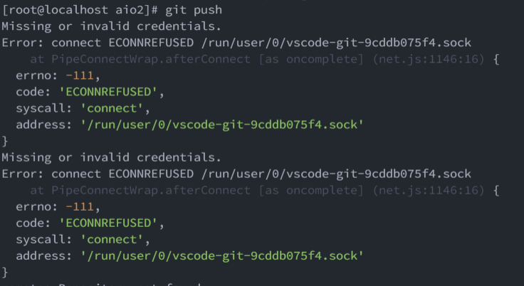 Error: connect ECONNREFUSED /run/user/0/vscode-git-9cddb075f4.sock
