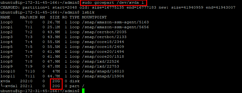 볼륨크기만큼 파티션을 늘리기 (sudo growpart /dev/xvda 1)