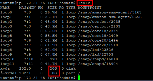 xvda라는 루트 볼륨에 xvda1이라는 파티션이 존재하는 것을 확인
