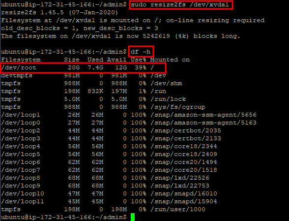 최종적으로 파일 시스템에 늘어난 볼륨 크기 반영되었는지 확인(dh -h)