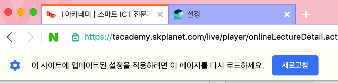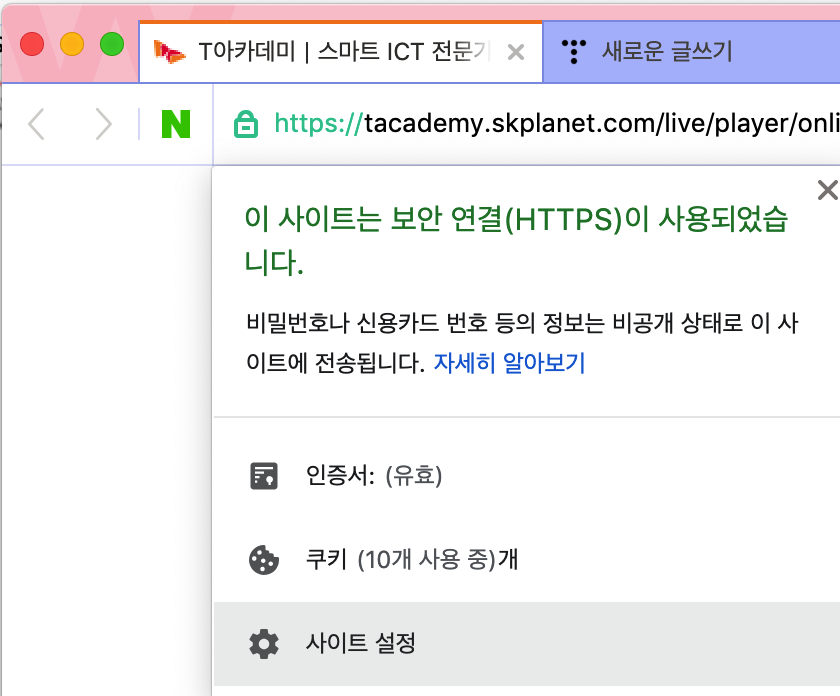 주소창 앞에 자물쇠 버튼을 클릭하여 사이트 설정에 들어간다.