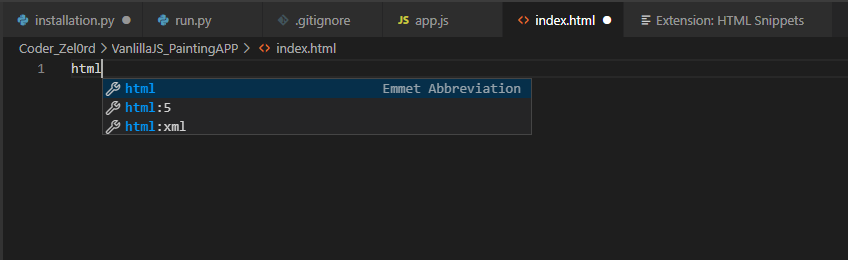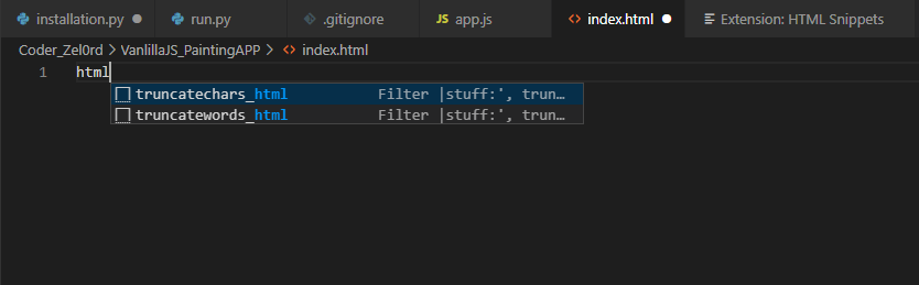index.html파일을 하나 열어줍니다. 그리고 html이라고 입력을 하면 suggestion이 뜨게 됩니다.