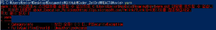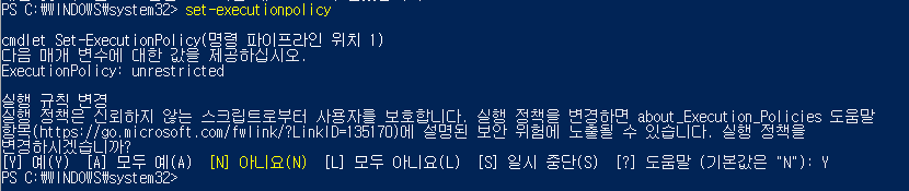 처음엔 권한 문제라길래 관리자 권한으로 실행해보았지만, 소용이 없었다. 그래서 찾아봤더니 powershell에서는 보안 문제로 스크립트 실행을 막아놨다고 한다.